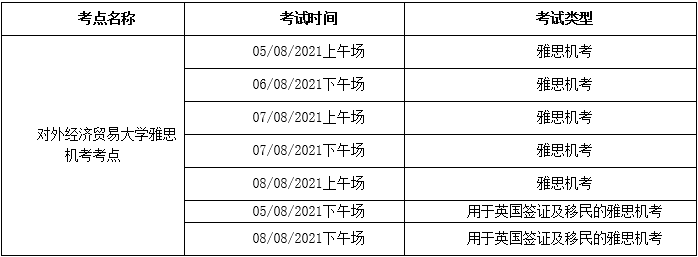 接英国文化教育协会通知,北京对外经济贸易大学雅思考点2021年8月以下场次的雅思机考、用于英国签证及移民的雅思机考因故取消。