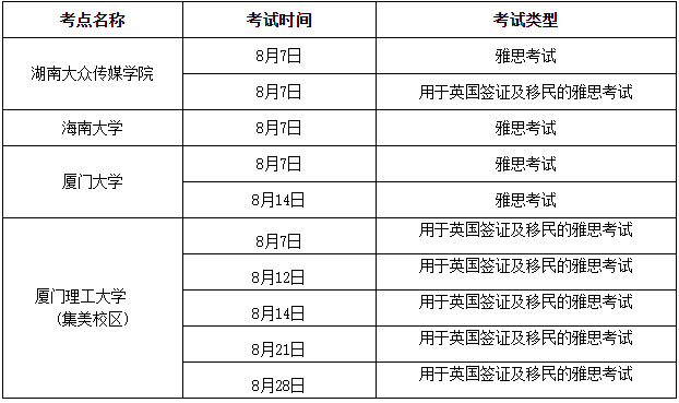 接英国文化教育协会通知,湖南大众传媒学院、海南大学、厦门大学和厦门理工学院雅思考点2021年8月以下场次的雅思考试、用于英国签证及移民的雅思考试因故取消。