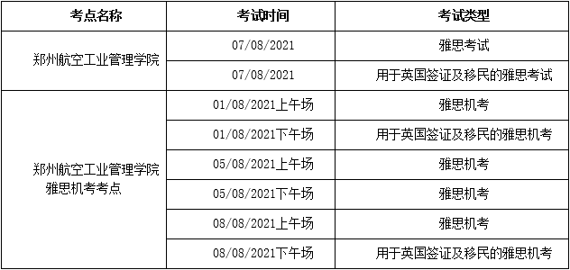 接英国文化教育协会通知,郑州航空工业管理学院雅思考点2021年8月以下场次的雅思考试、雅思机考、用于英国签证及移民的雅思考试、用于英国签证及移民的雅思机考因故取消。