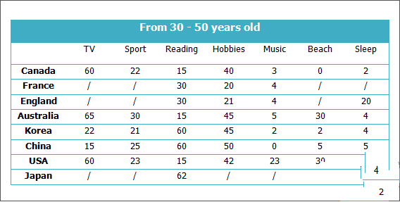 According to the given figures, Watching TV is the most popular pastime activity among the 30 to 50 years old people in Canada, Australia and the USA. The people of these three countries who are between 30 to 50 years old spent their 60-65 of past time watching TV. Korean, Japanese and Chinese people of this age group prefer to read books while listening music is most popular among the people of this age group in the USA. Participating in sports is higher in Korea, China, Australia, USA, and Canada than other countries. Interestingly Sleeping and going to beach are two least preferred activities and English citizens of this age group spend their pastime mostly by reading, sleeping and spending time in their hobbies. No data apart from reading is given for the Japanese people and French people prefer to read than any other activity. Sleeping is least popular in Canada and the USA where only 2% people of this age group spend their leisure time sleeping.