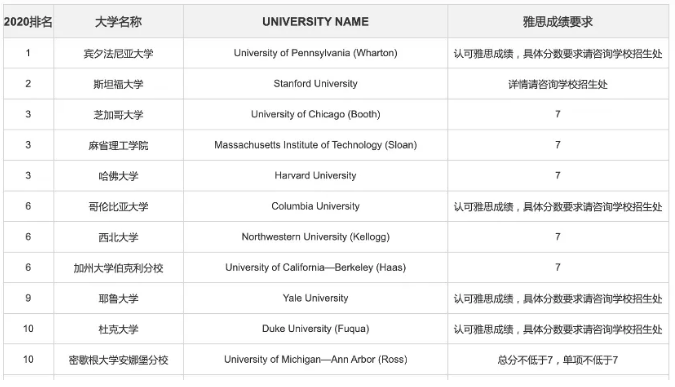 而在U.S.News美国商学院排名(研究生)TOP30的高校中,大多数针对雅思成绩的要求为7分。