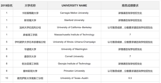 除此之外,U.S.News美国计算机科学专业排名(研究生)TOP30中的大多数高校对于雅思成绩要求无明确要求(根据往年录取案例来说,都在6.5以上),而在前十名中,排名第一的麻省理工学院和排名第六的康奈尔大学要求7分,排名第十的德克萨斯大学奥斯汀分校要求6.5分。